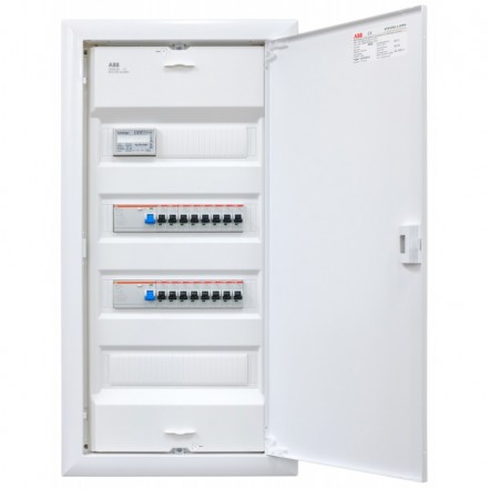 Mit Zähler bestückter ABB (STRIEBEL&JOHN) Unterputz 4-reihig UK648N3 ANSCHLUSSFERTIG verdrahtet mit Klemmblock. Bestückung ABB 2